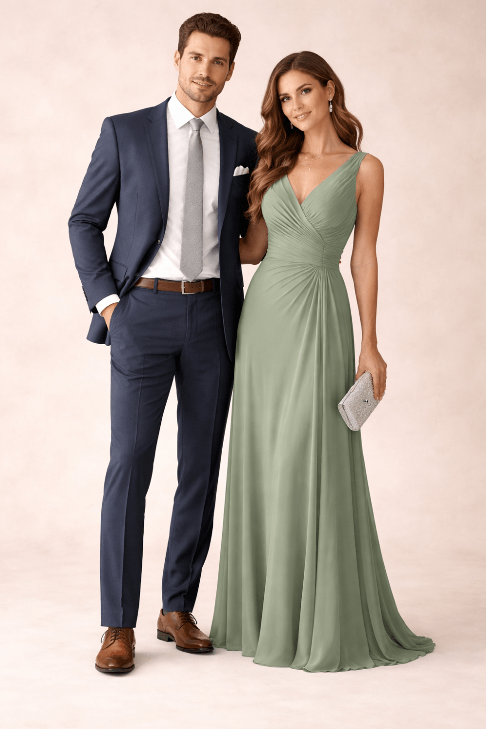 A gravata será entregue no momento da retirada do traje — uma lembrança dos noivos para vocês, não sendo necessária a devolução. O sapato deve ser clássico, social e sem brilho e camisa branca lisa.